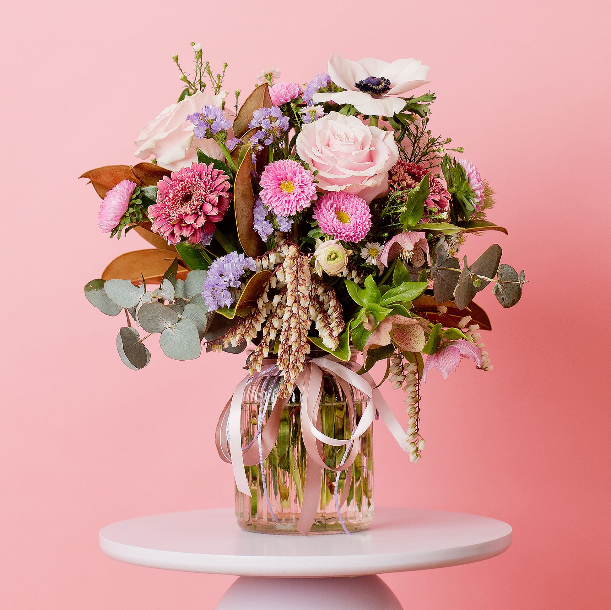 These sweet and pretty blooms are unmistakably charming, perfectly presented in a glass linear jar with playful ribbon. Add a pop of pretty pastel colour and personality to your home or gift her away happily and make someone smile.