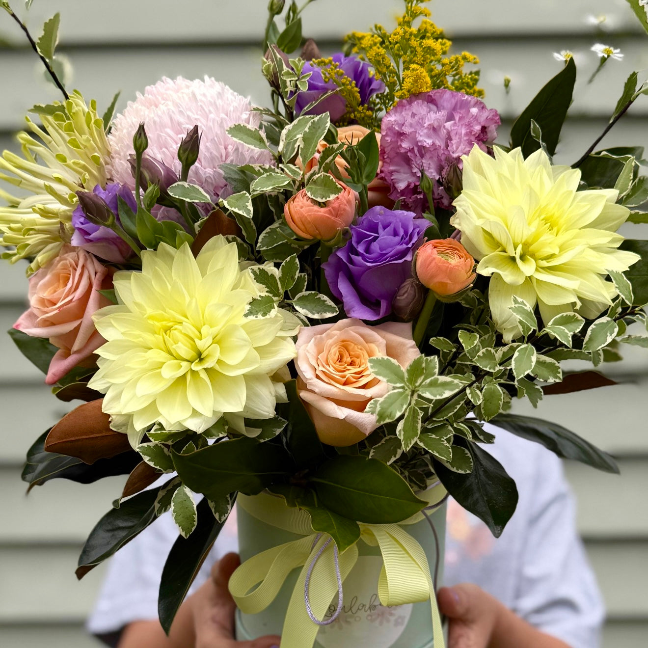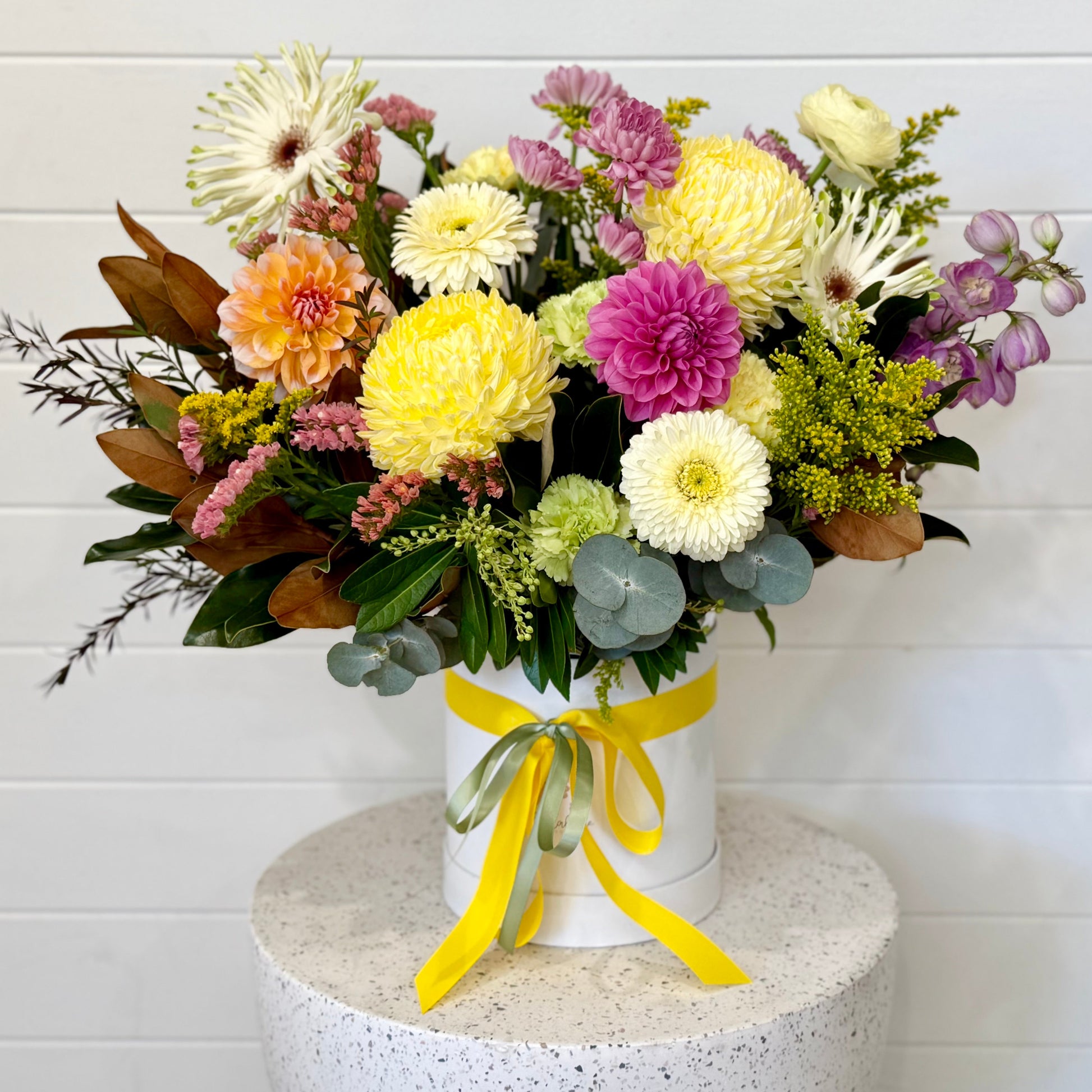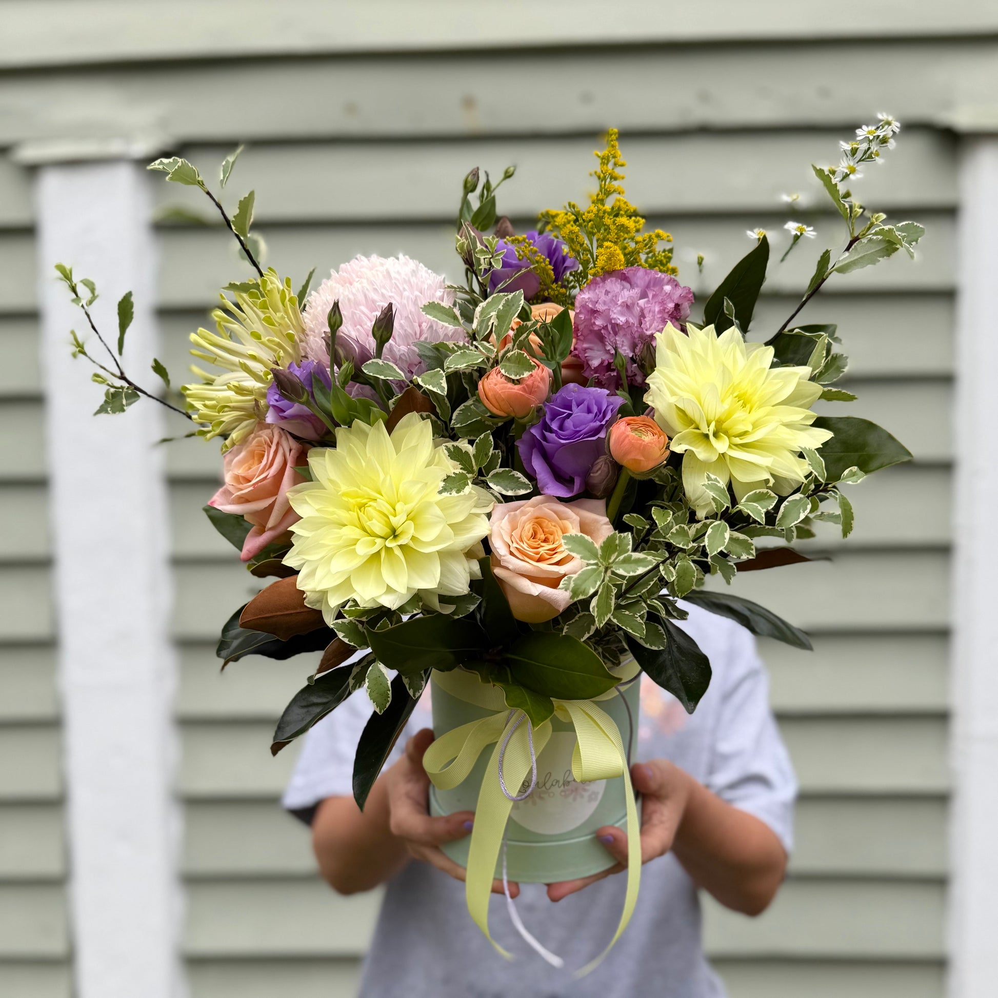 Flowers come arranged into a sage green hatbox with our fun ribbon.