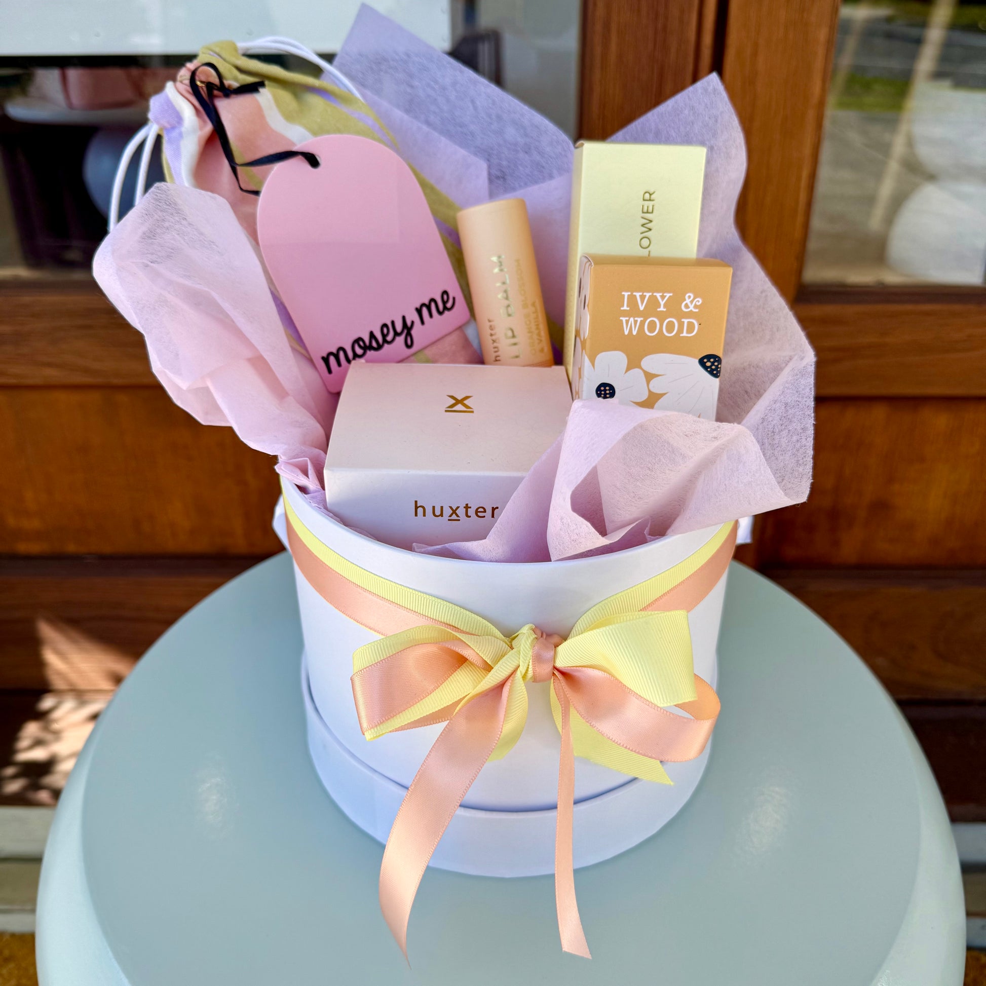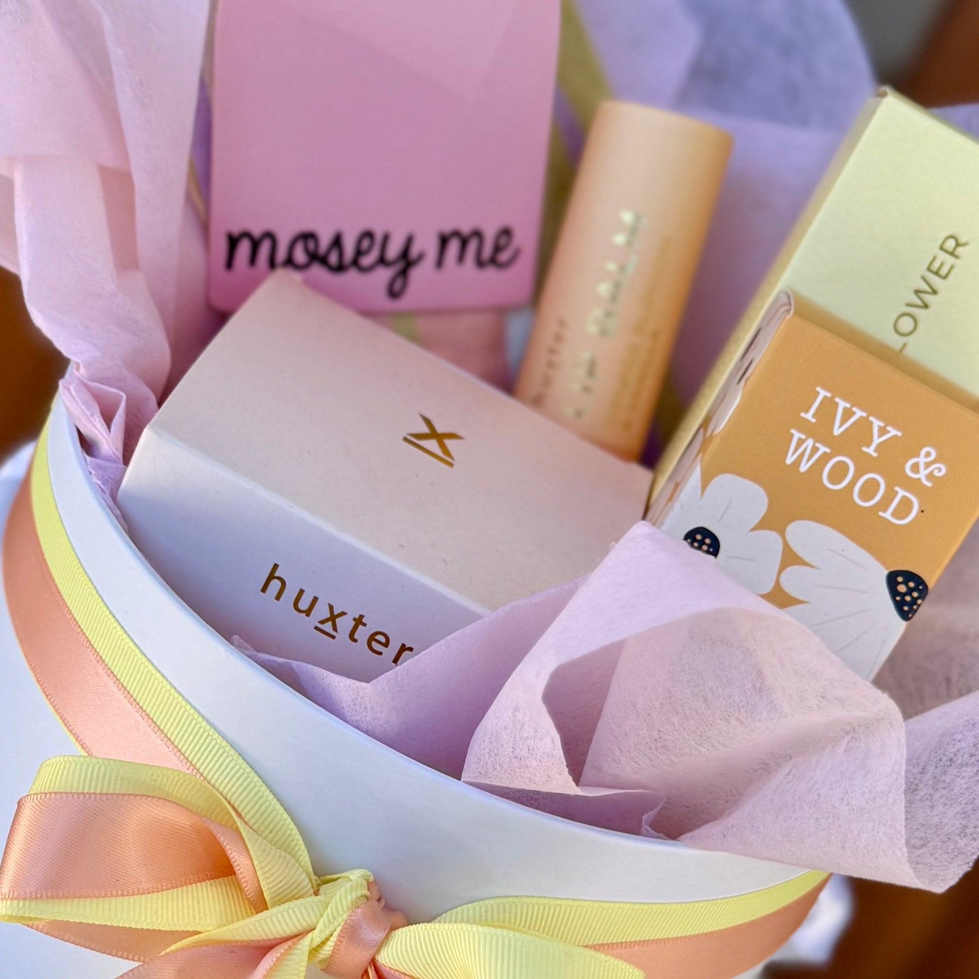 Indulge yourself with this delicious hamper filled with heavenly hand cream, nourishing lip balm, and an irresistible candle all from Huxter. Let the enchanting fragrance of Ivy and Wood fill your space, creating a cozy, inviting atmosphere. Then drift off peacefully with the ever so popular soft, soothing sleep mask from Mosey Me.