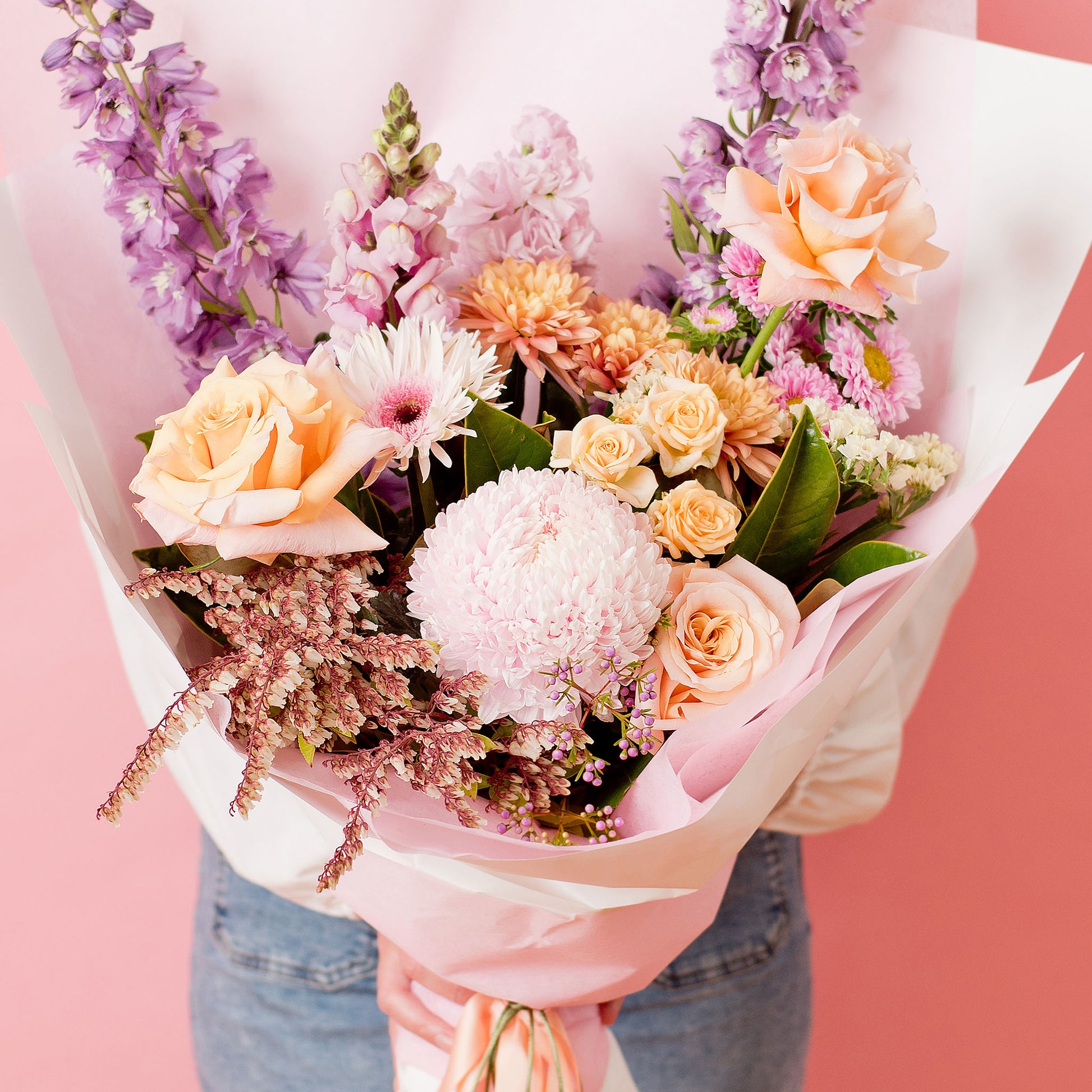 an irresistible mix of frilly, fabulous blooms bursting with peachy vibes. This playful bouquet has soft, sunset  hues and charming textures, perfect for spreading smiles...