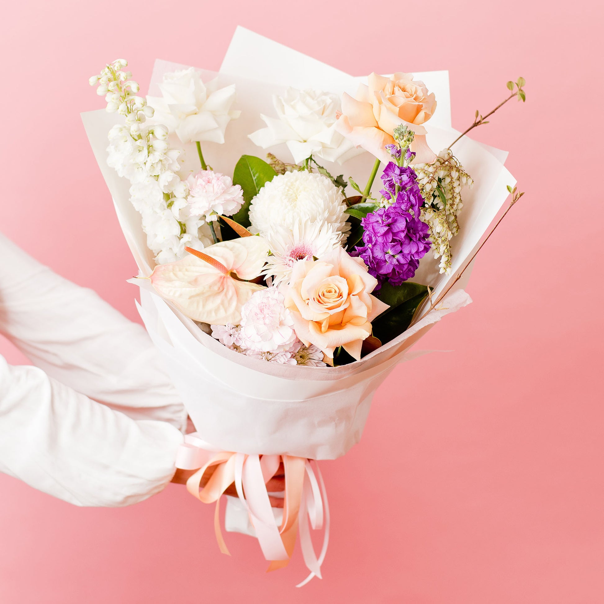 Bouquet comes wrapped in our signature style wrap with water suitable for the day.